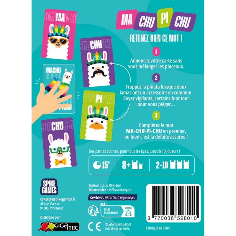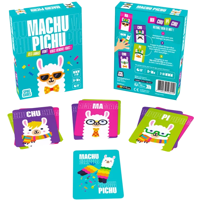 Mais ce n’est pas tout ! Lorsque vous retournez une carte, annoncez le mot écrit dessus. Si une séquence MA-CHU-PI se forme, frappez immédiatement la piñata en criant “CHU” pour terminer le mot. Le dernier récupère toutes les cartes des autres…